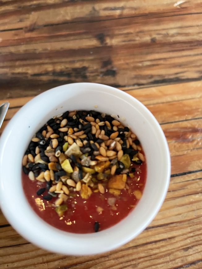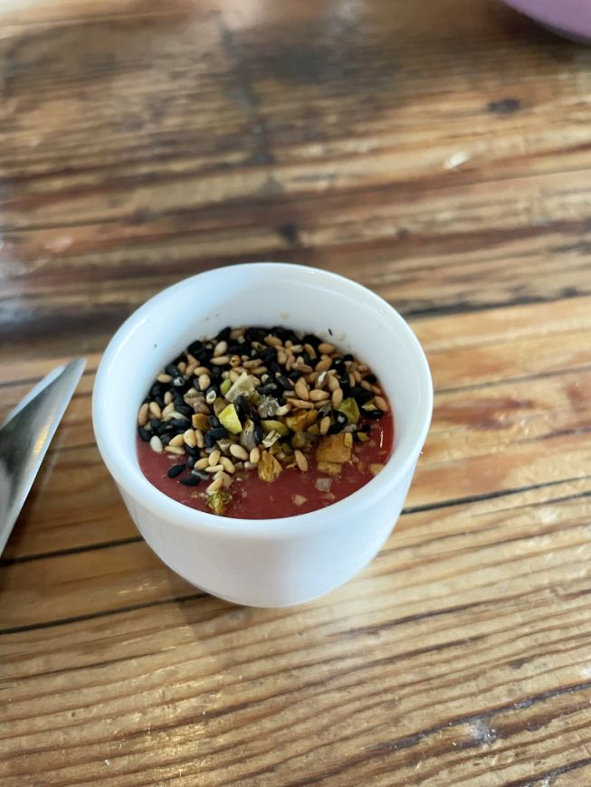 Savory panna cotta served with a strawberry sauce and topped with sesame seeds. It is salty, tangy, sweet, creamy, and delicious. It is also served and cleanse palate.