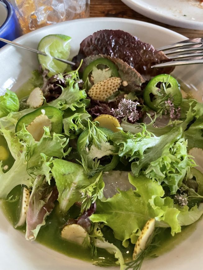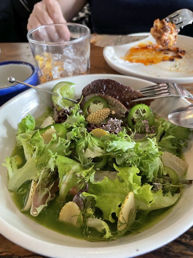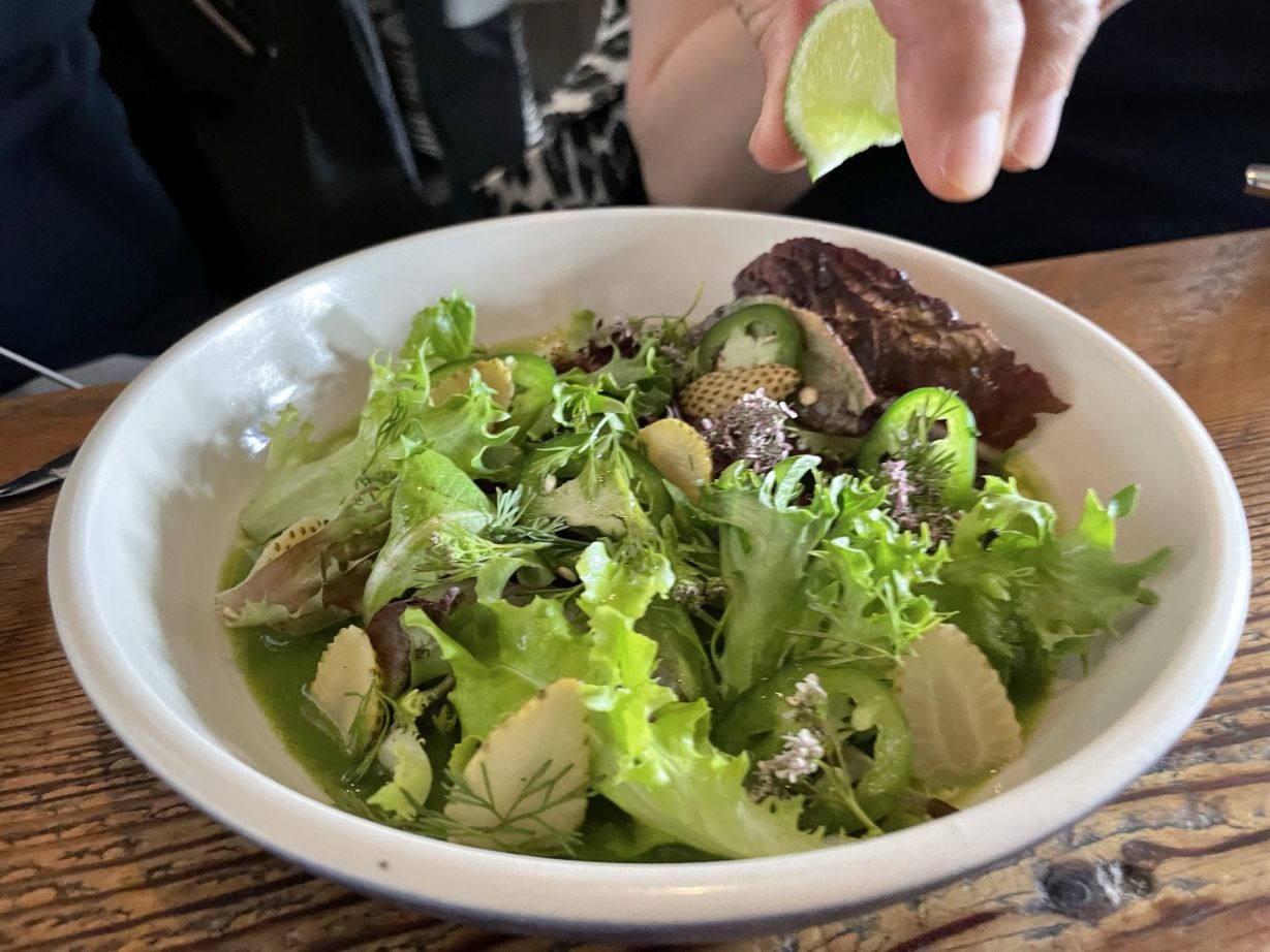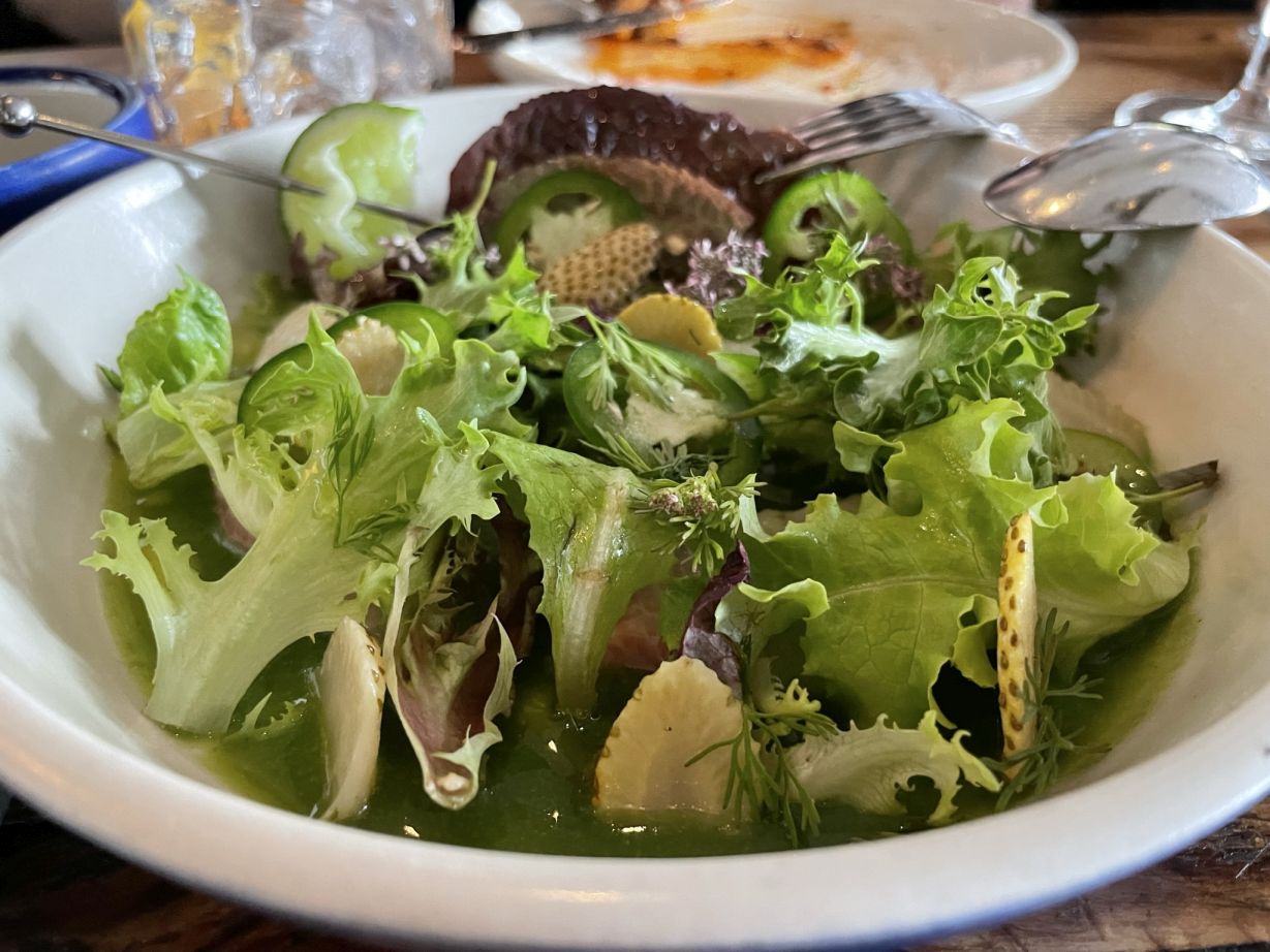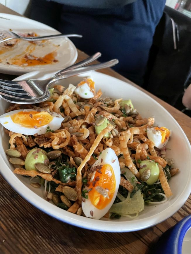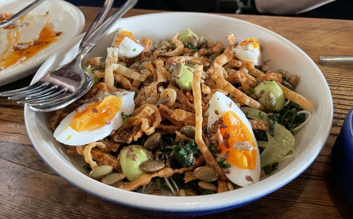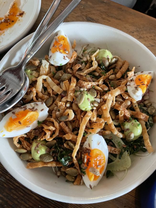 Chopped kale salad, fennel, radish, crispy wonton, Jidori egg, za'atar.