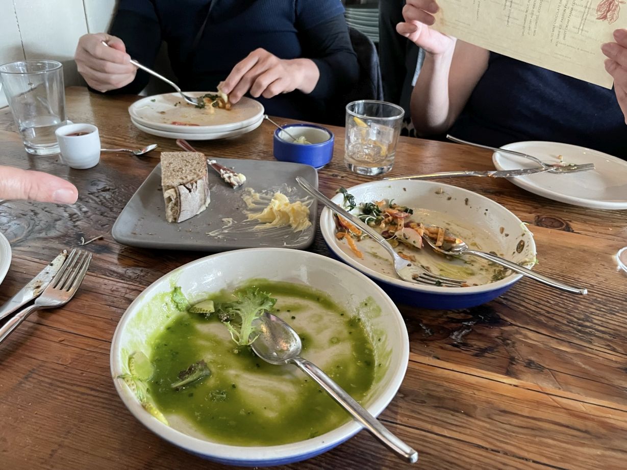 Appetizers courses are done and new plate, fork and spoon are brought out.