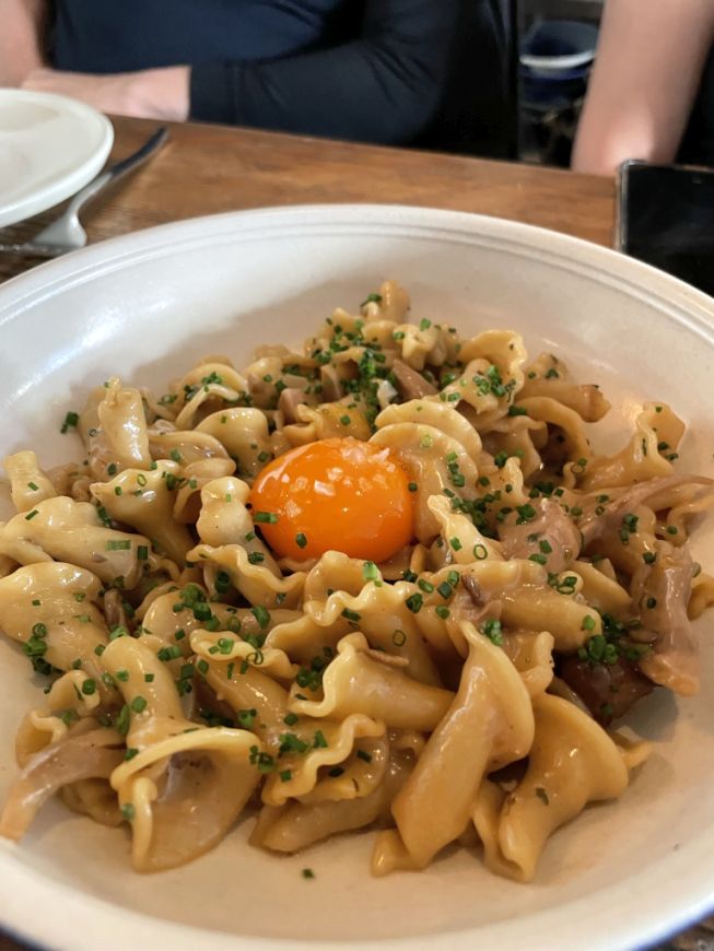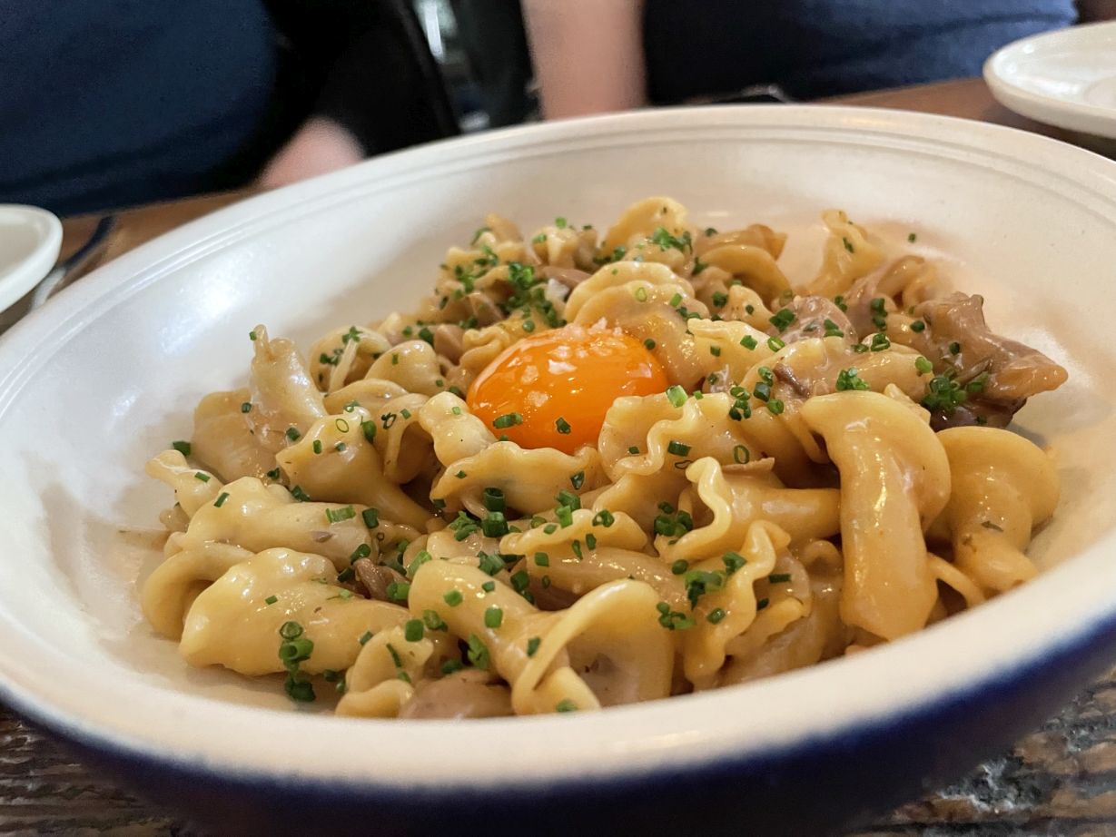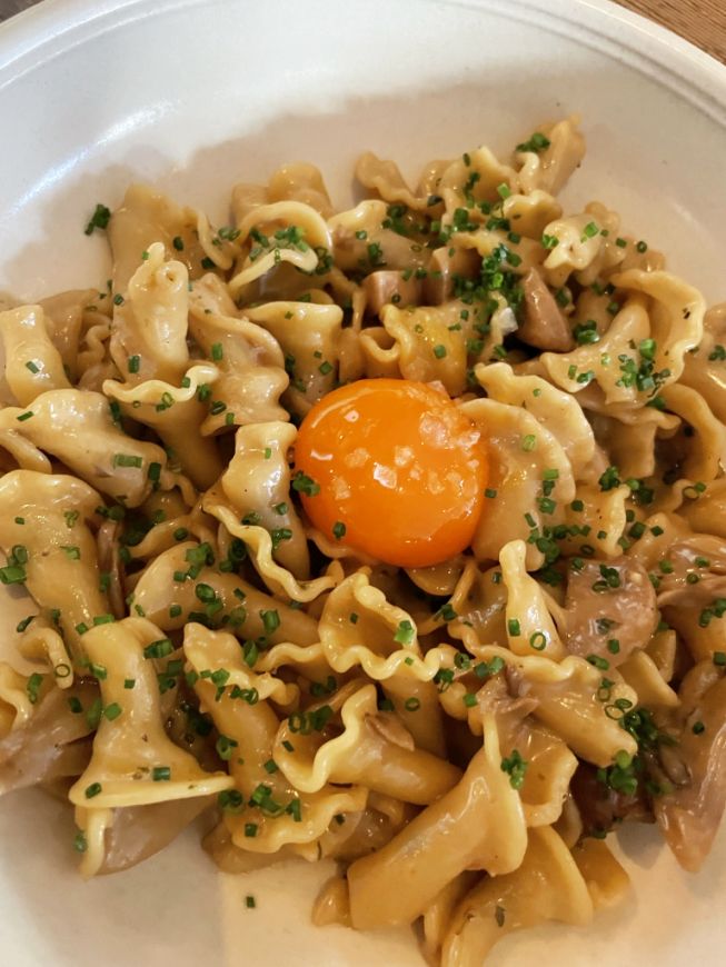 Campanelle, marinated mushroom, shoyu, smoked jidori egg yolk.
