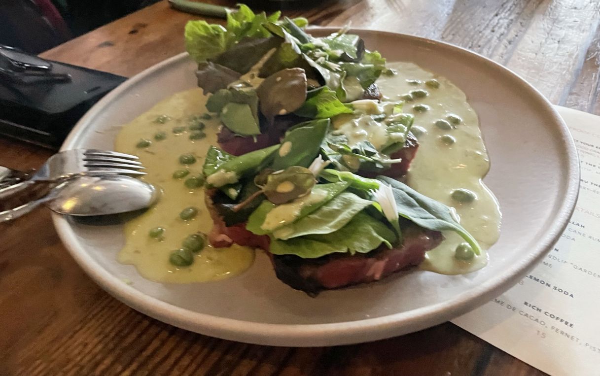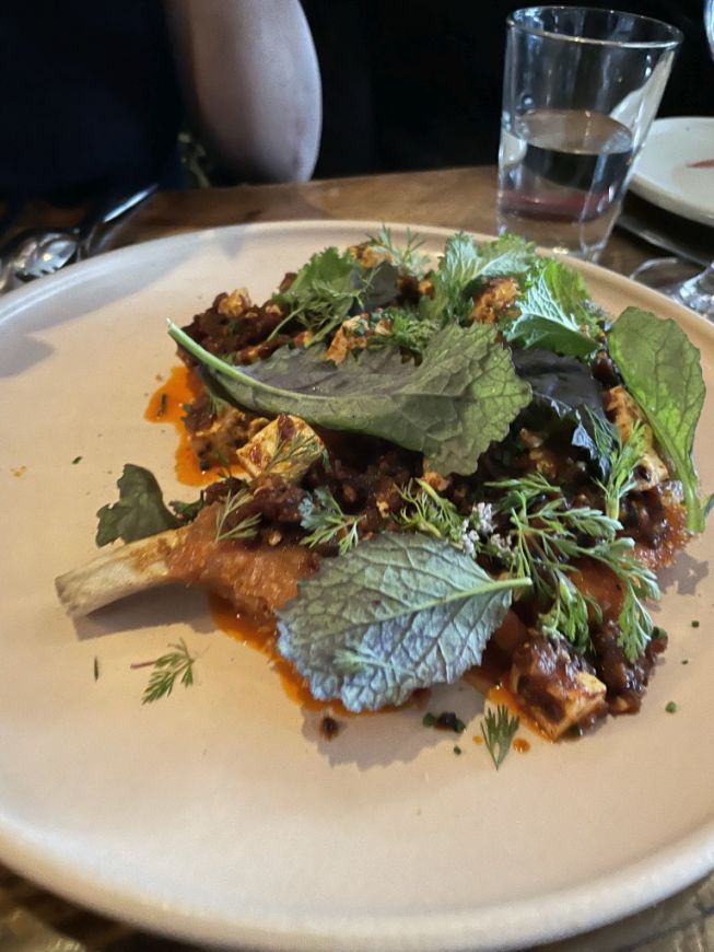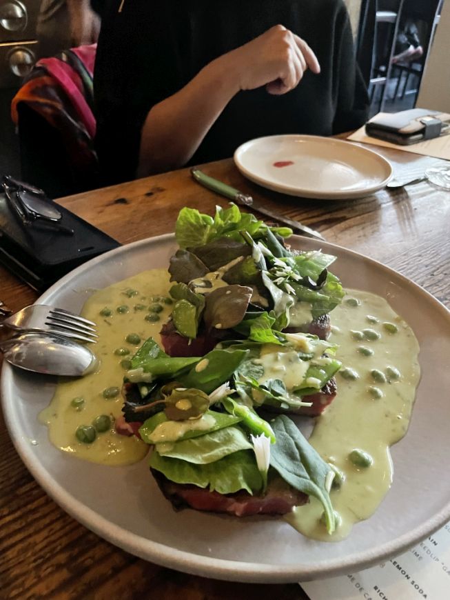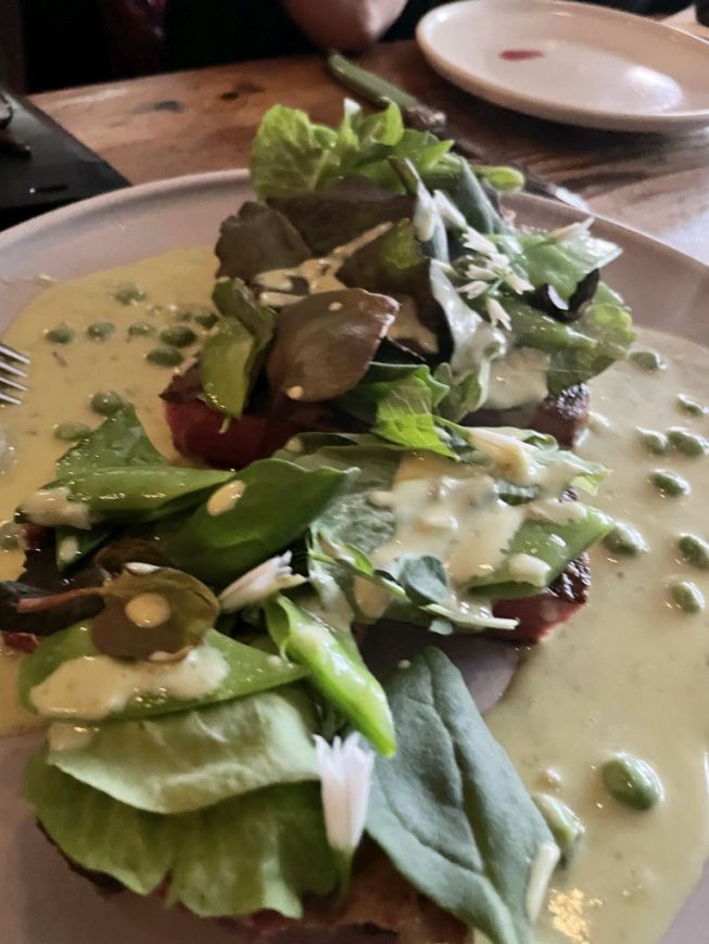 21 Day dry aged rib eye, sugar snap pea, "pea=Monte", spring herb.