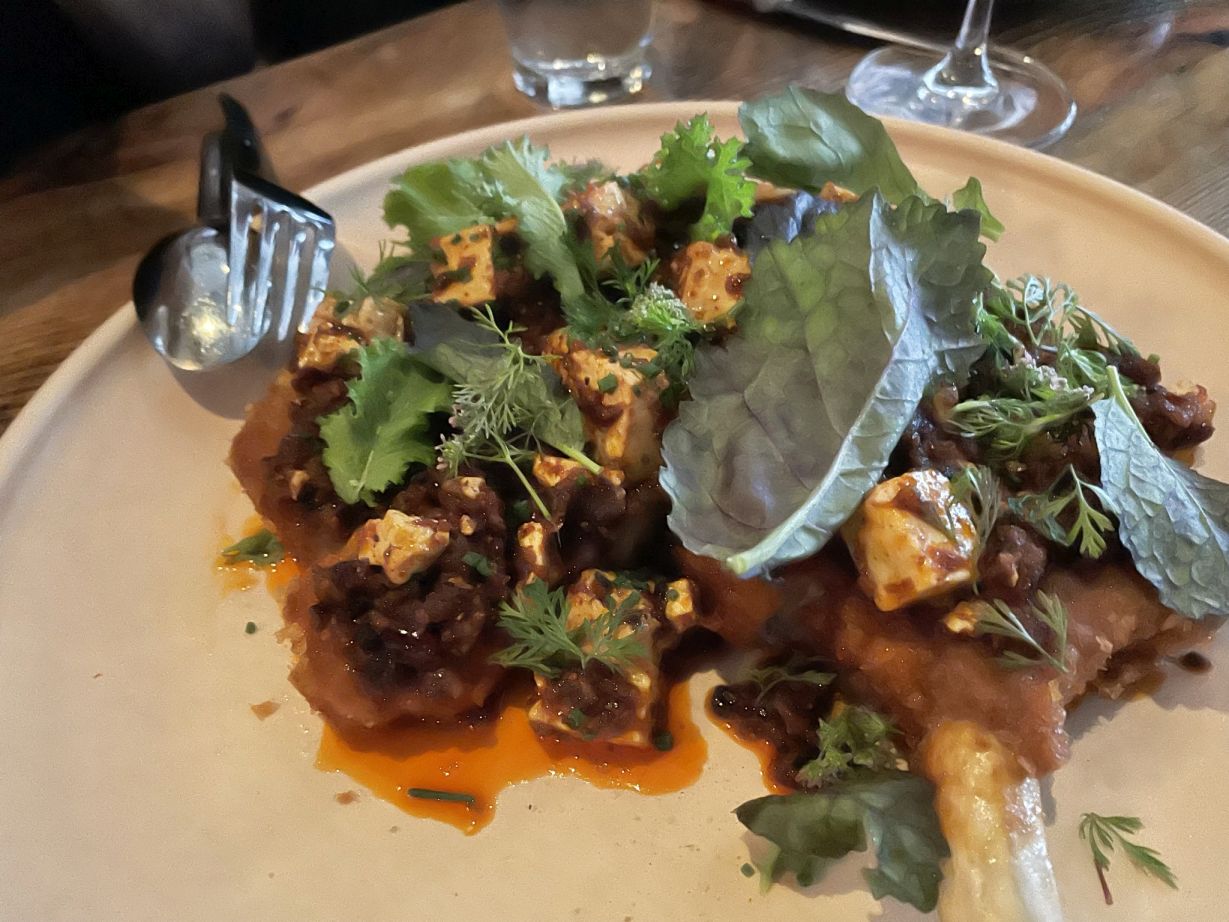 Pork Schnitzel, Joodooboo "Ma Po Tofu", bacon, flowering mustard.