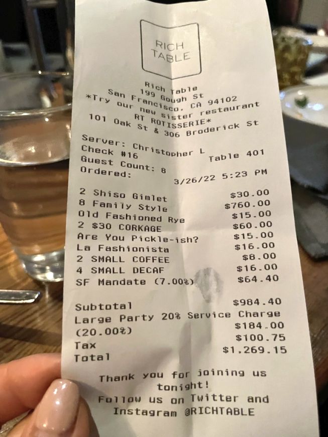 The bill for 8 people, tax and tips are included. Around $160/person. |