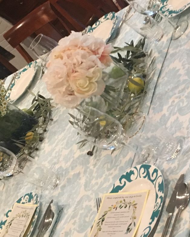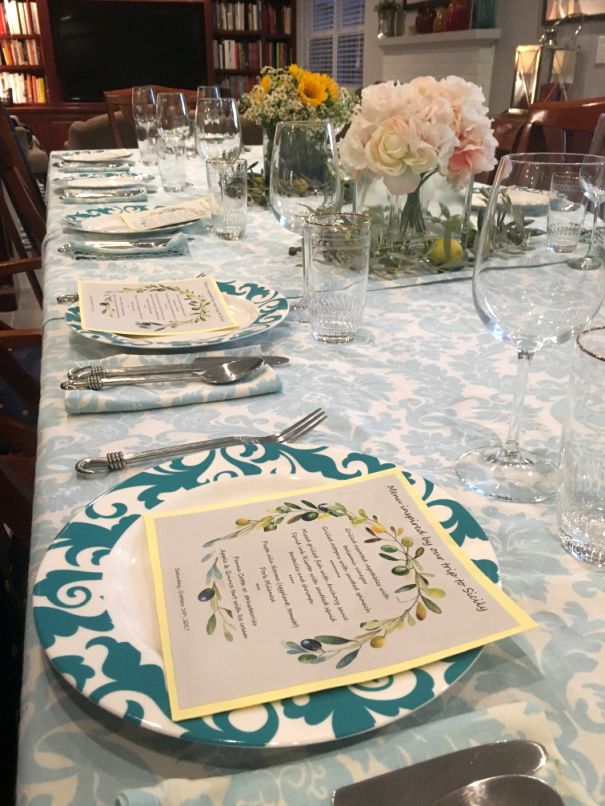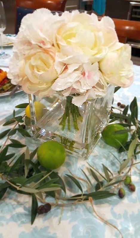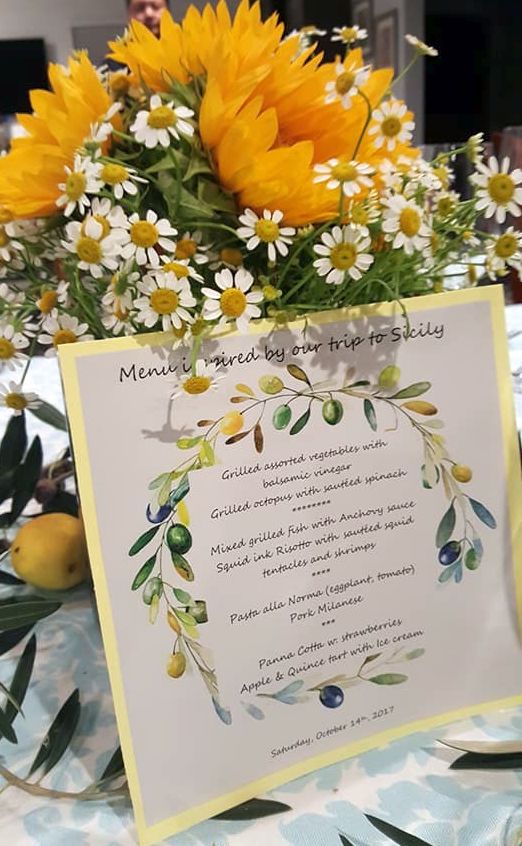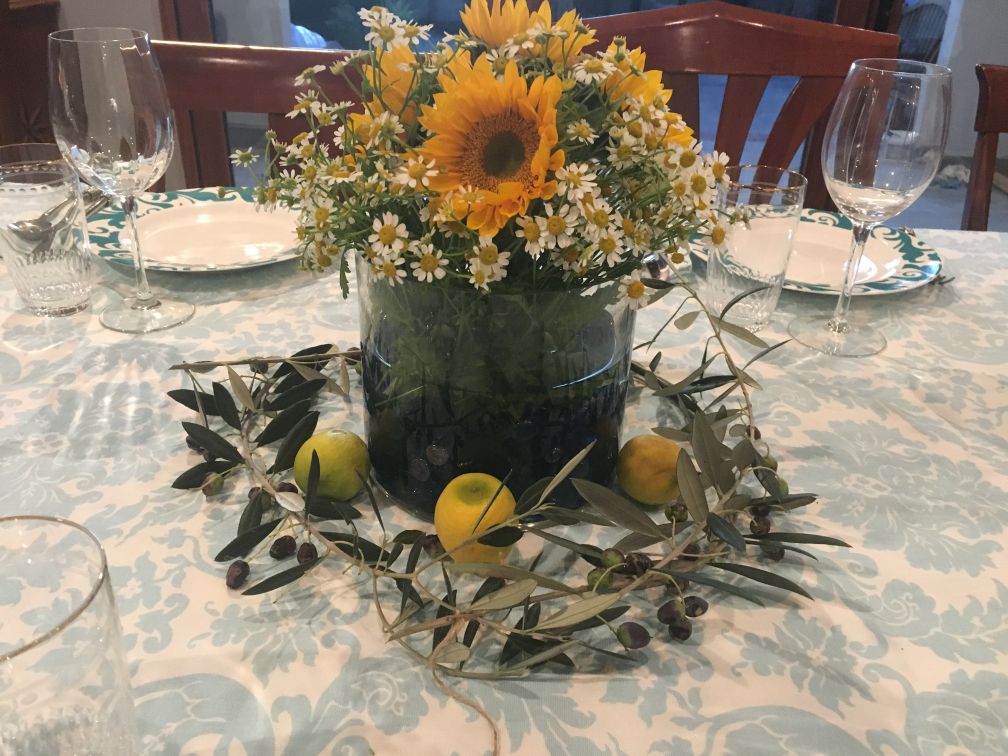 When I think of Sicily what I see is bright yellow sun flowers, olive oil, and fresh lemons and all the ingredients are reflected in my centerpiece,