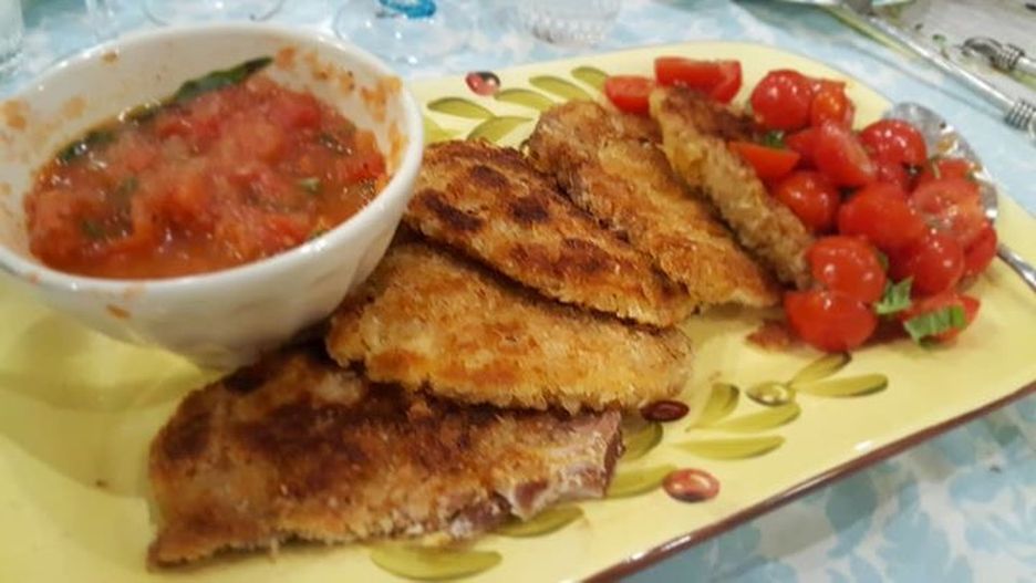 Pork chop a la Milanese served with fresh tomatoes salad and tomatoes sauce with basil.