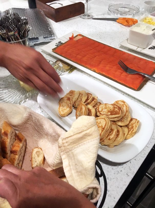 We tried it both ways: with blini and with baguette, and I think everyone preferred to eat caviar with butter and baguette.