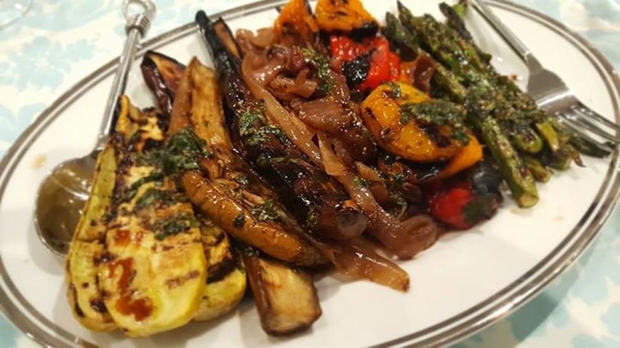 Assorted grilled vegetables (yellow squash, eggplant, red and white onion, asparagus, and red and yellow bell peppers) drizzled with olive oil and balsamic vinegar.