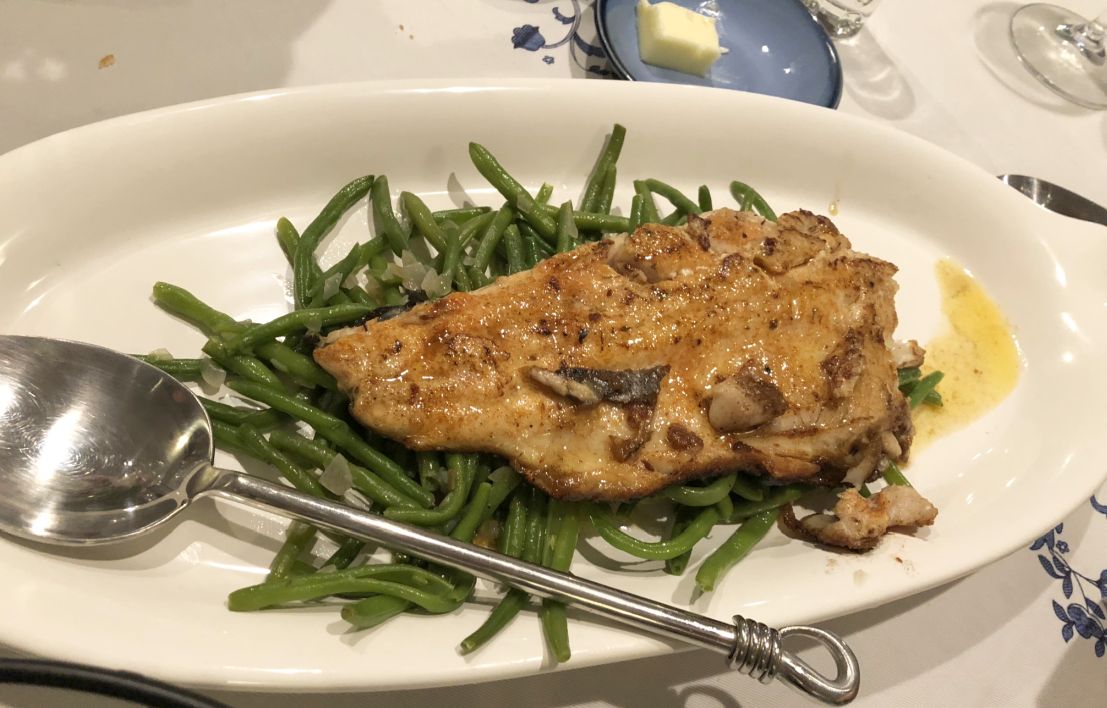Sole (trout) Meunière on a bed of sautéed green beans.