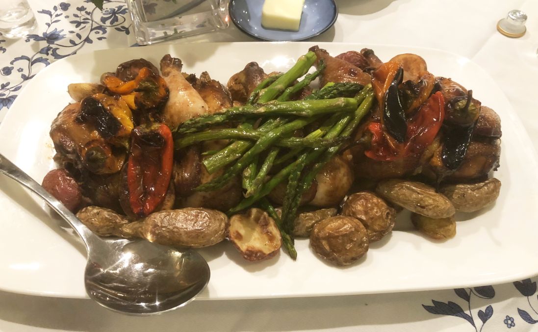 Course #5-Since I was not sure if everybody could eat fish, so I am also serving a honey roasted Cornish hen with potatoes, bell peppers, and asparagus.