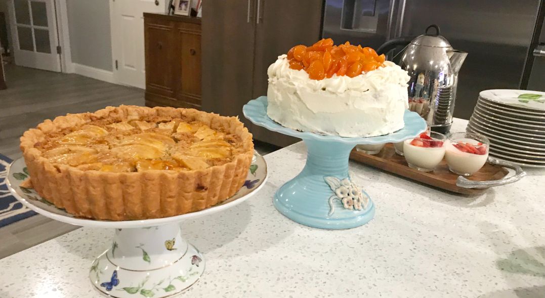 Almond apple tart, genoise with candied kumquats, panna cotta with macerated strawberries,