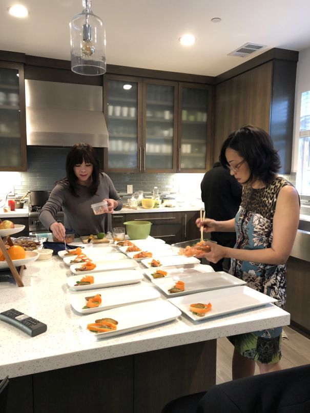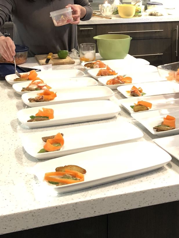 Cocktails are served and now I am plating the first course with the help of Maily.