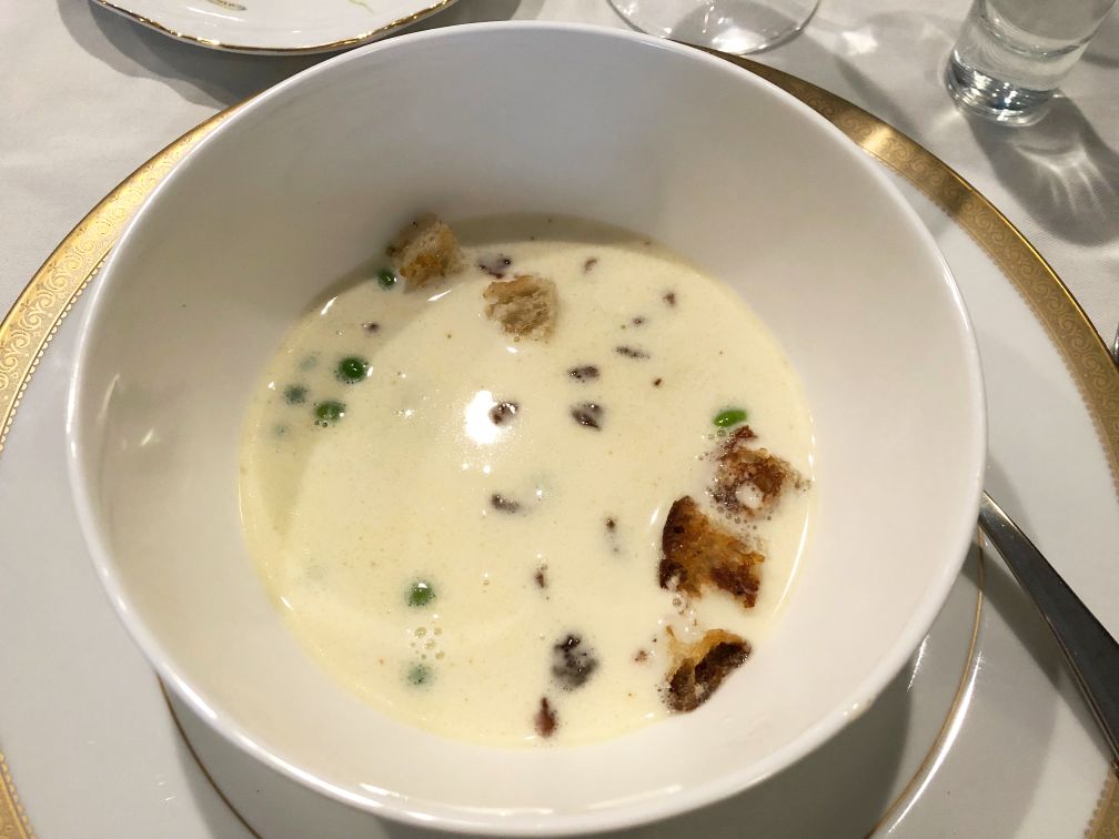 Course #2: Parmesan soup-peas, crouton & bacon