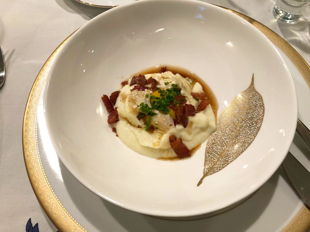 Course #3: Cauliflower puree, egg, bacon, and burned butter.