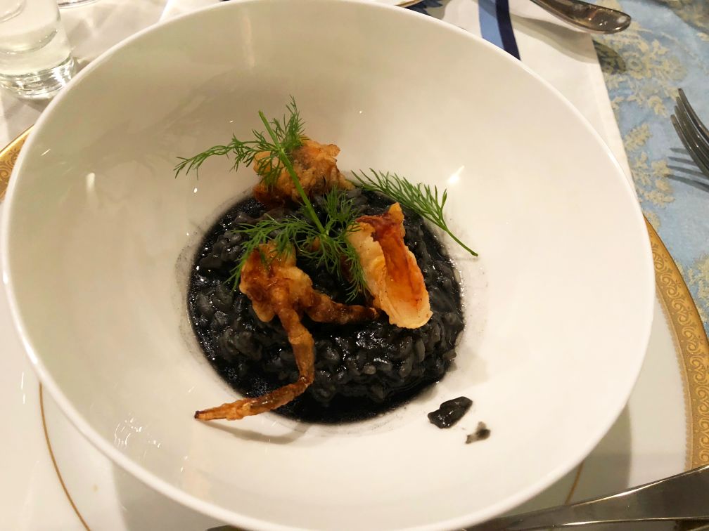 Course #4: squid ink mushroom risotto with soft shelled crab and shrimp tempura.