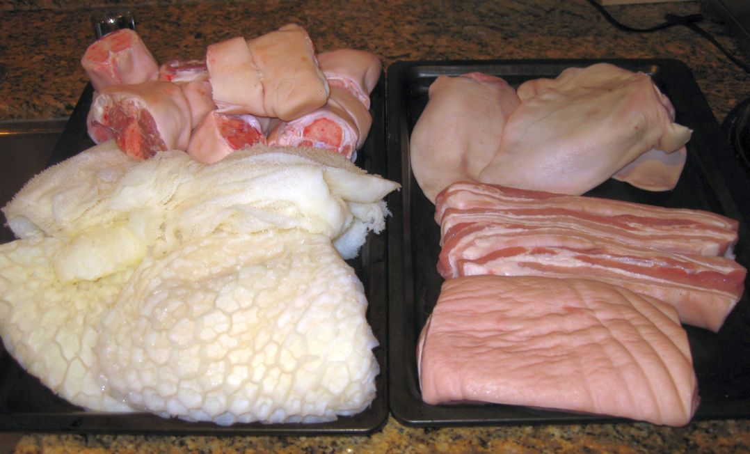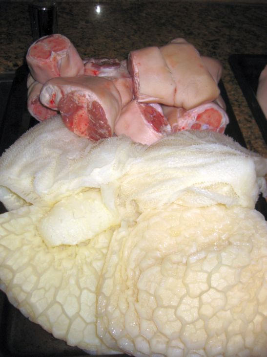 Went to store and got all the ingredients: Honey comb tripe, feather tripe, pork feet, Pork belly, and pig's ears.