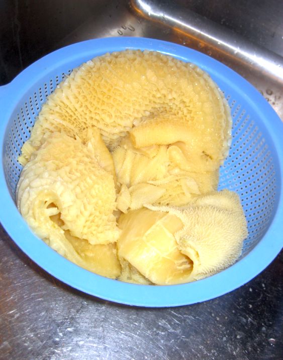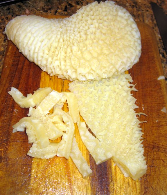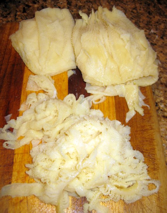 Pour the water from the tripe pot into a colander. Drain the tripe and w hen the tripe are cooled off cut into slices.