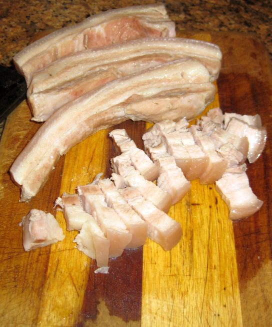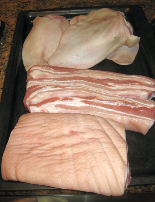 The pork Belly and Pig's ears are now ready. Pour all the water and put the meat on a large tray.