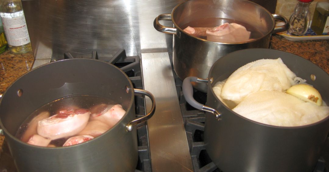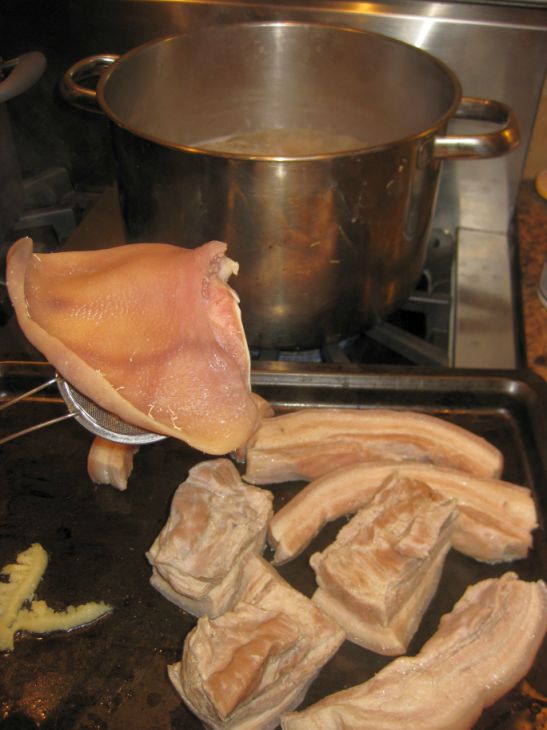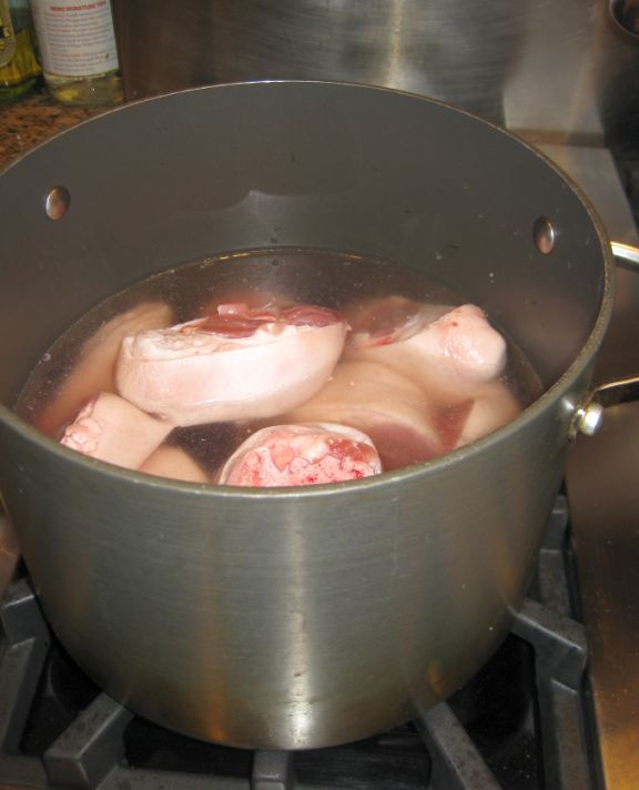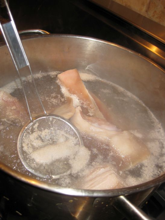 For the pig trotters you will need to bring the water to a boil, skim all the scum, pour all he water, rinse the pork trotters and refill the pot with fresh water. Add some salt, bring to a boil, and reduce to a simmer for about 2 hours. |