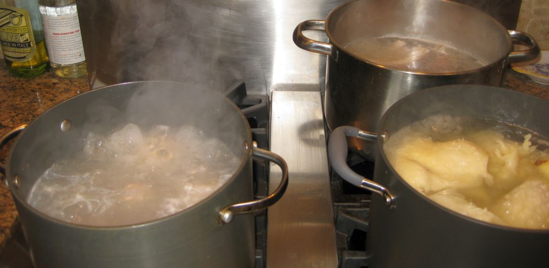 One for the tripe, one for the pig trotters, and the third pot for the pork belly and the pig's ears.