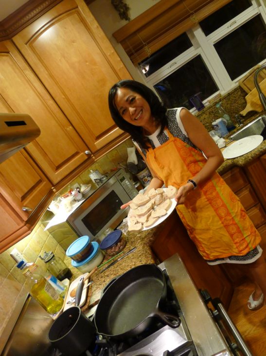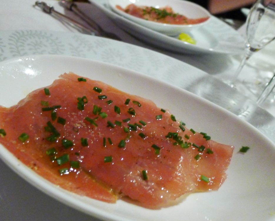 Re-arranging the tuna on the plate. You can see Miriam in the background in this picture. |