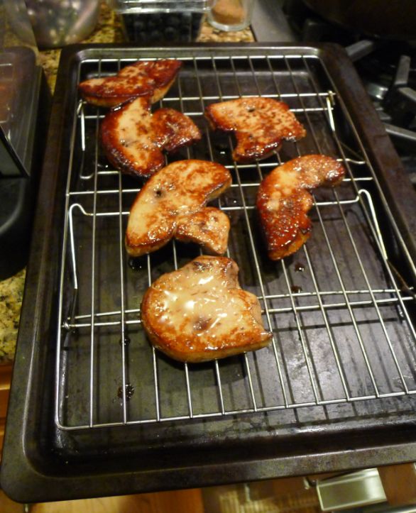 Pan seared Foie gras resting on a cooler rack while I am cooking a 2nd batch. While waiting for the 2nd batch the whole tray goes in the oven to keep the foie gras warm. |