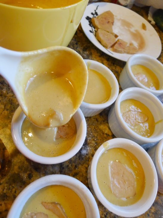 Ground almond is added to the butter and Foie gras mixture. Pouring the ganache mixture into ramekins and piece of foie gras is added in the center of each ramekin.
