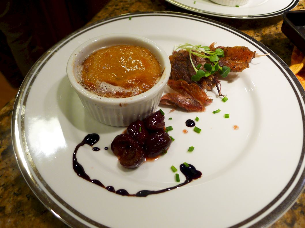 Final presentation: serving the foie gras ganache with duck confit, sautéed cherries in butter and brown sugar, and reduced balsamic port sauce.