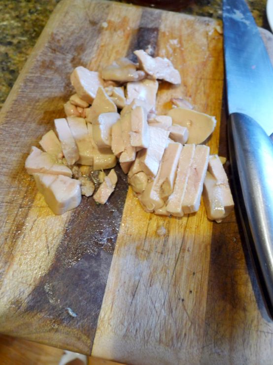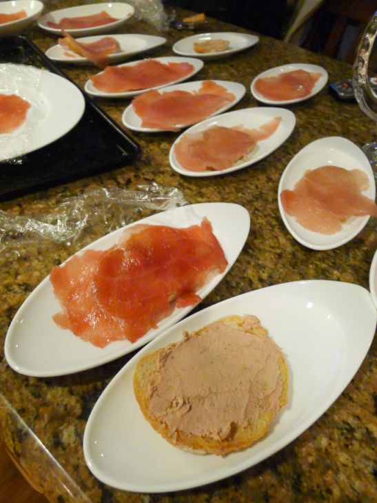 The foie gras are prepared a head of time and store in the refrigerator until it is time to serve.
