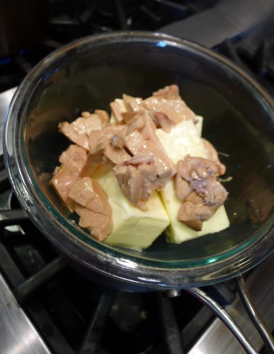 This dish is prepared ahead of time. First I am preparing the ganache by melting butter and Foie gras.
