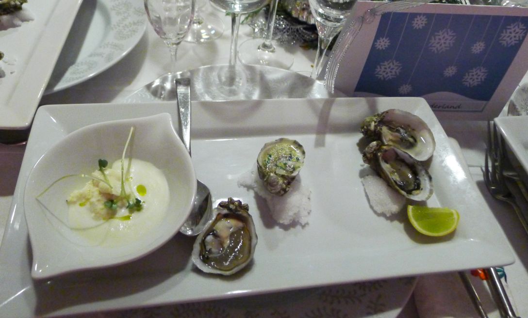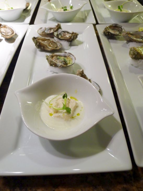 1- Cauliflower chaud-frois with celery emulsion foam served with fresh oyster on the side.