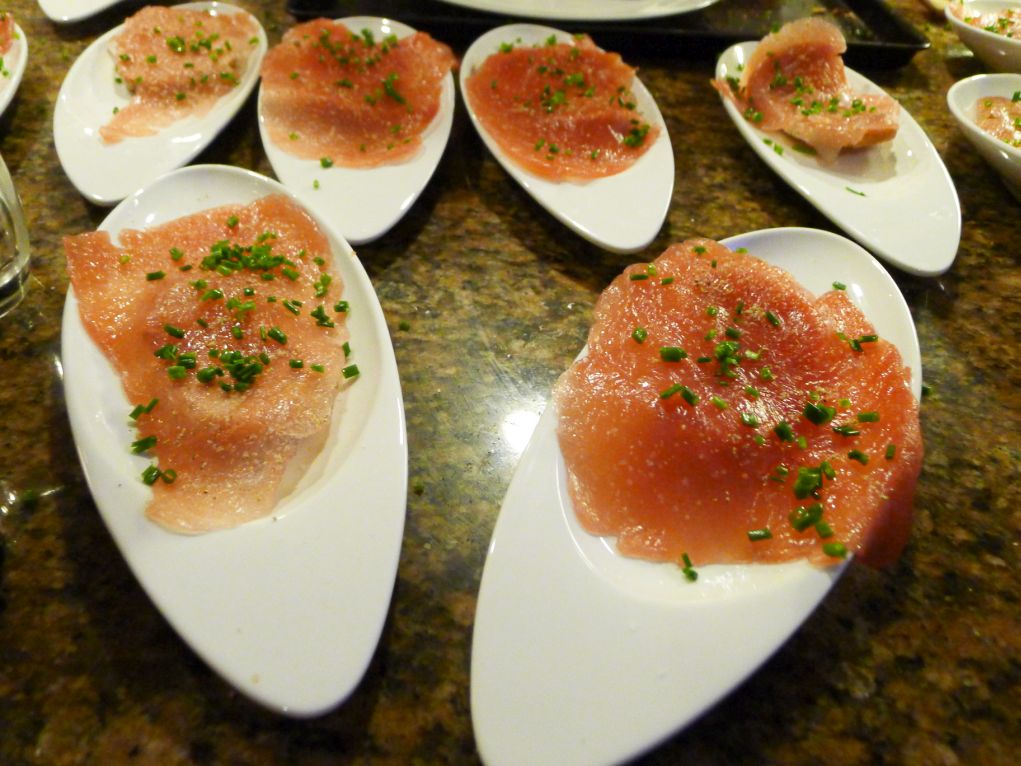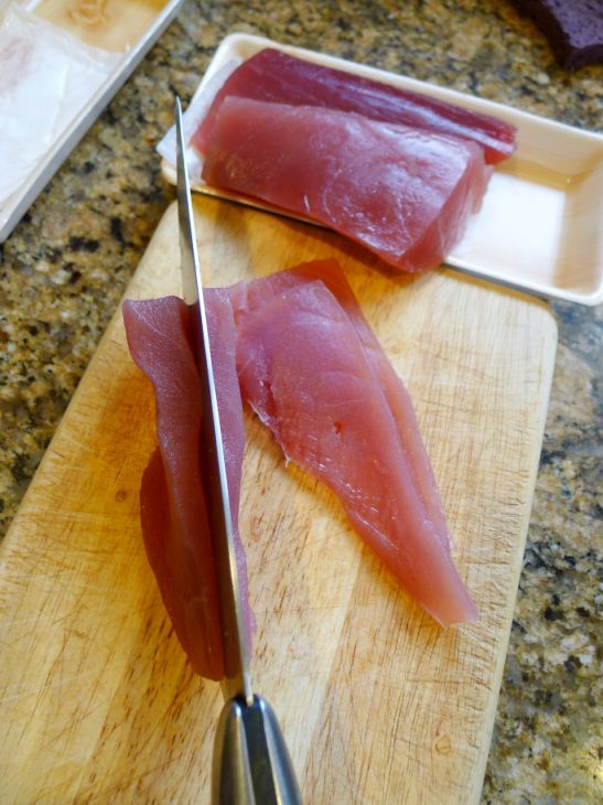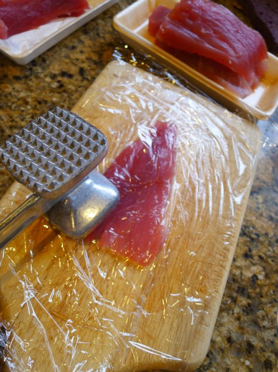 Tuna are sliced and then thinly pounded. The Tuna are prepared ahead of time and when it is time to serve I just remove the tuna from the refrigerator.