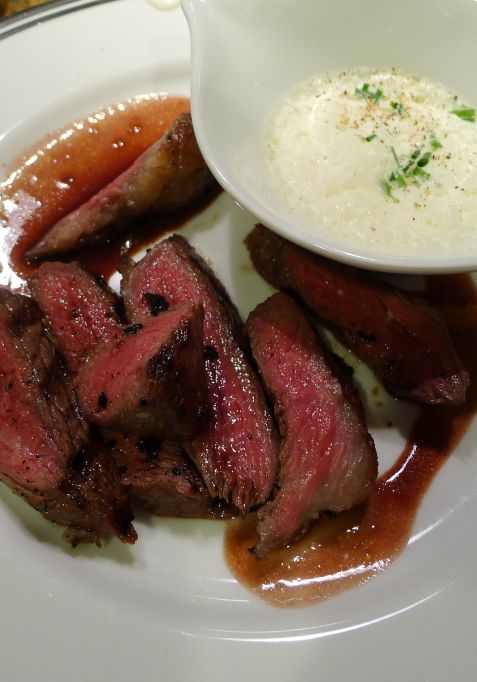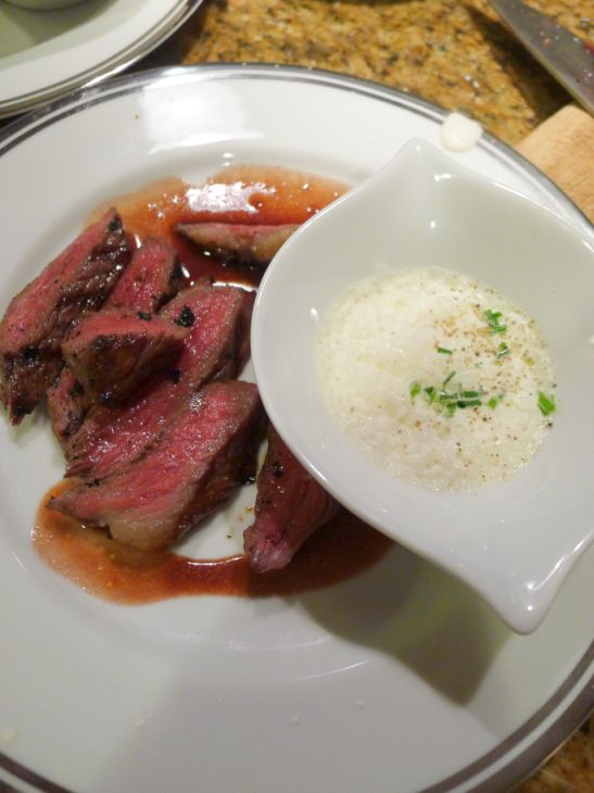 Final presentation: grilled waygu culottes with red wine sauce and served with a bone marrow foam.