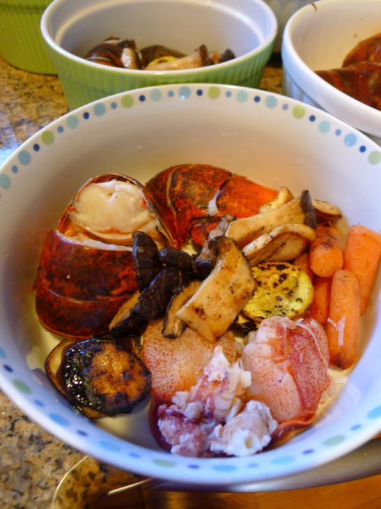 lobsters are poached and vegetable are pan seared ahead of time. Here I am putting together the pot pie.