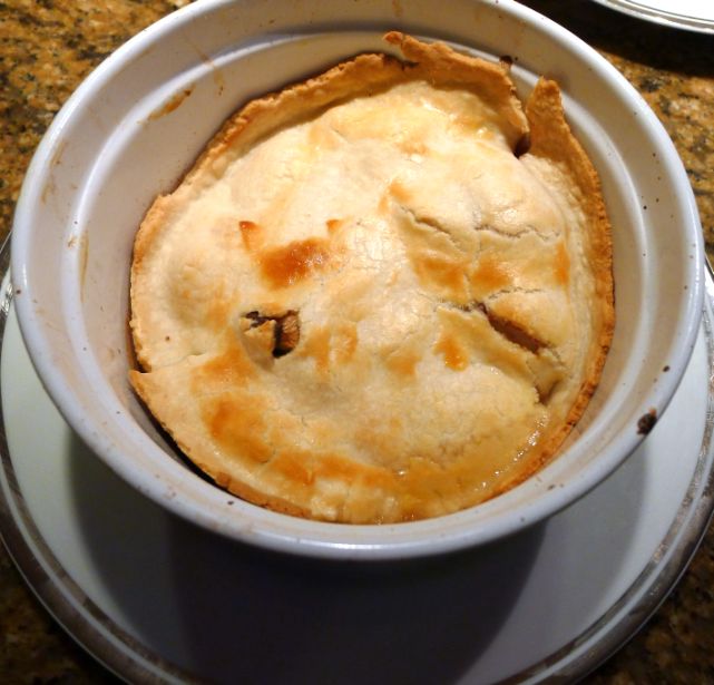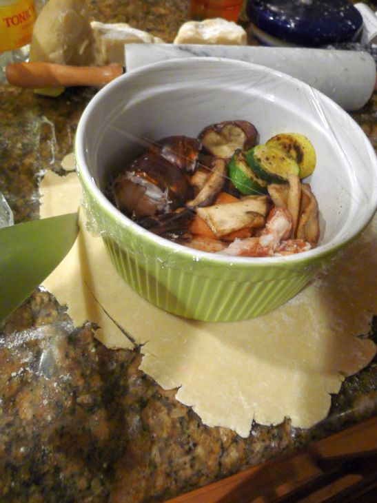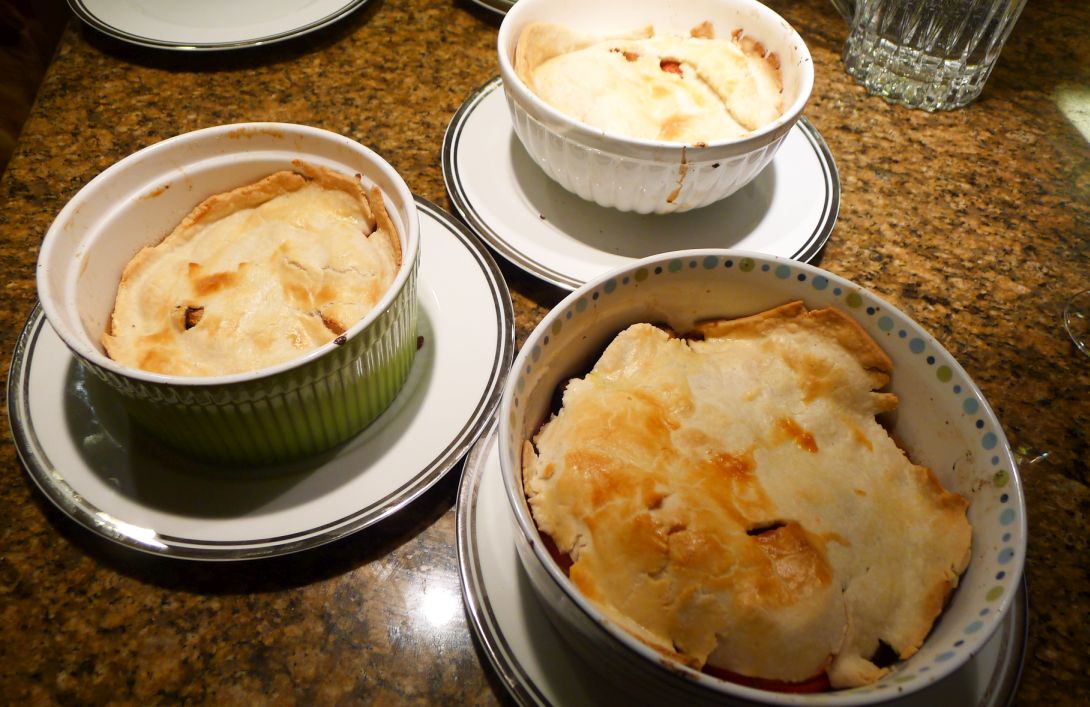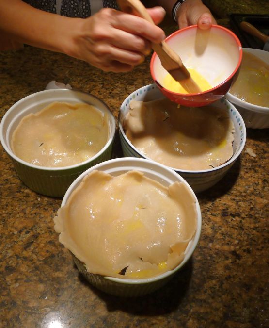 Adding the crust on top of each bowl and then brushing some egg white on top. The pot pie goes into the oven for about 20 minutes or until the pastry is golden brown.