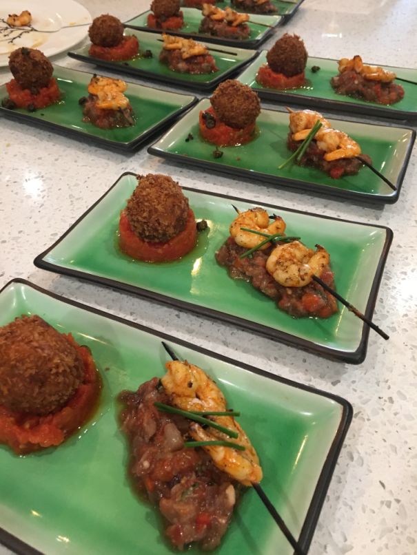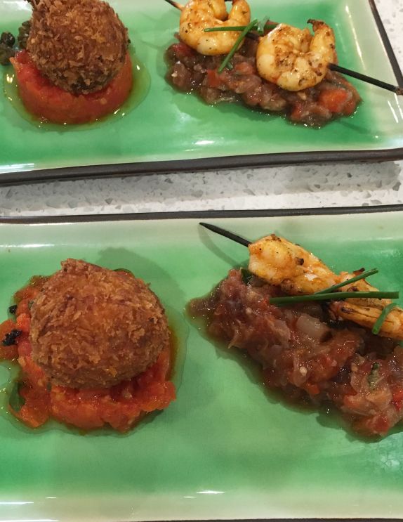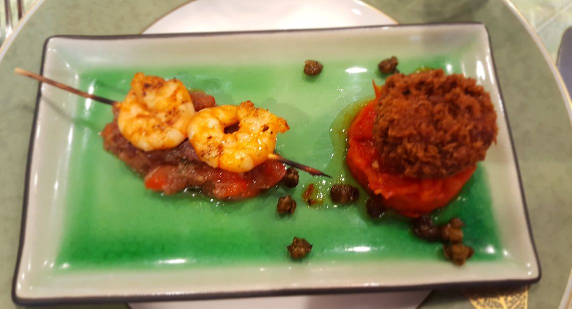 1-Brochetta de Gambas (shrimp skewer) on a bed of Pisto Manchego (Spanish ratatouille)