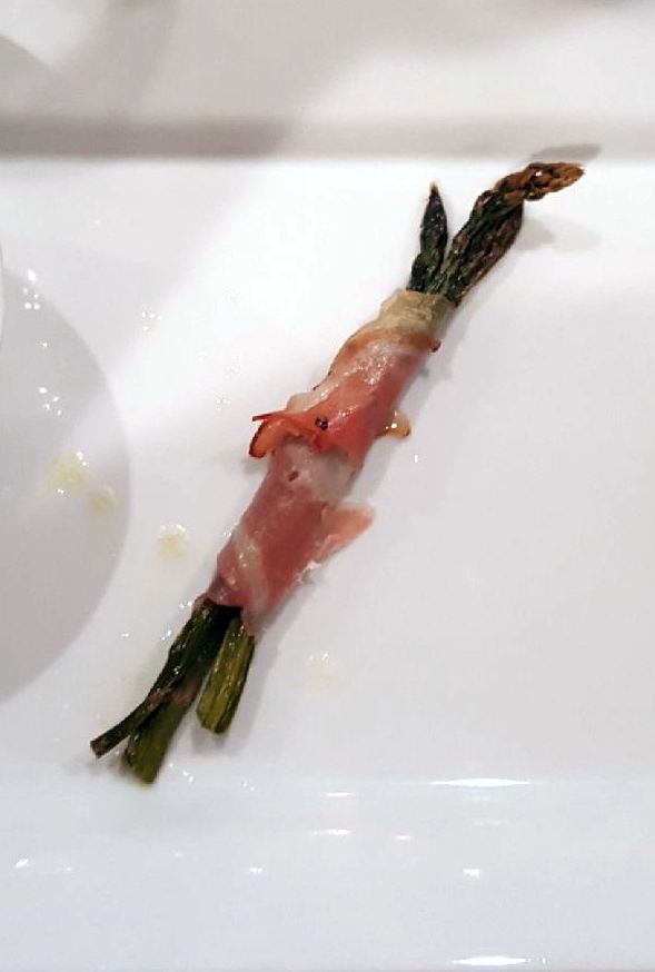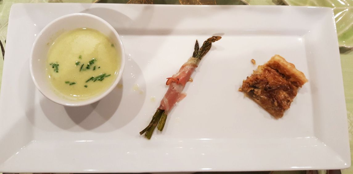 2-Asparagus Vichyssoise, roasted asparagus wrapped in prosciutto, Quiche with caramelized onion and mushroom