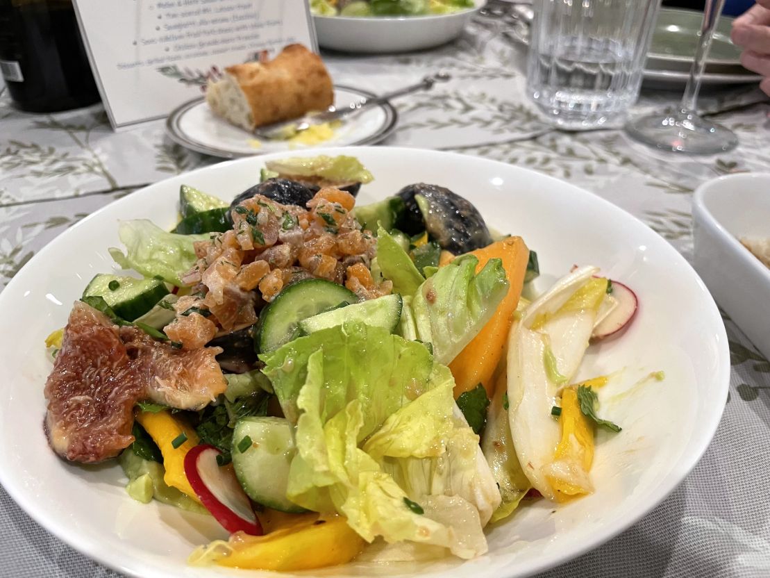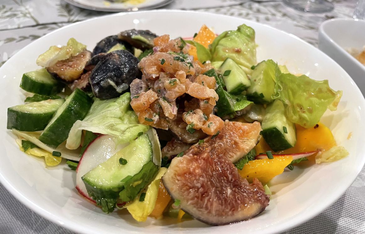Melon, figs, cucumber, butter lettuce, radish, endive salad on a bed of avocado puree.