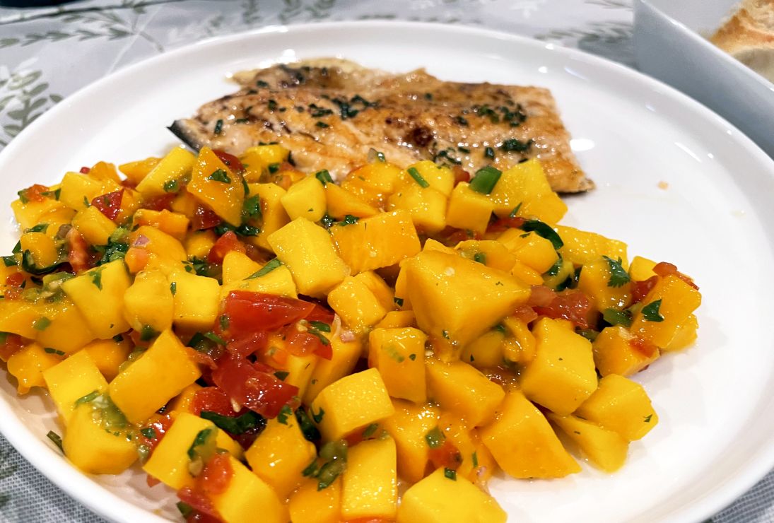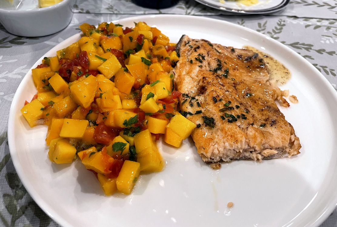Pan seared Mt. Lassen trout with beurre noissette and mango salsa.