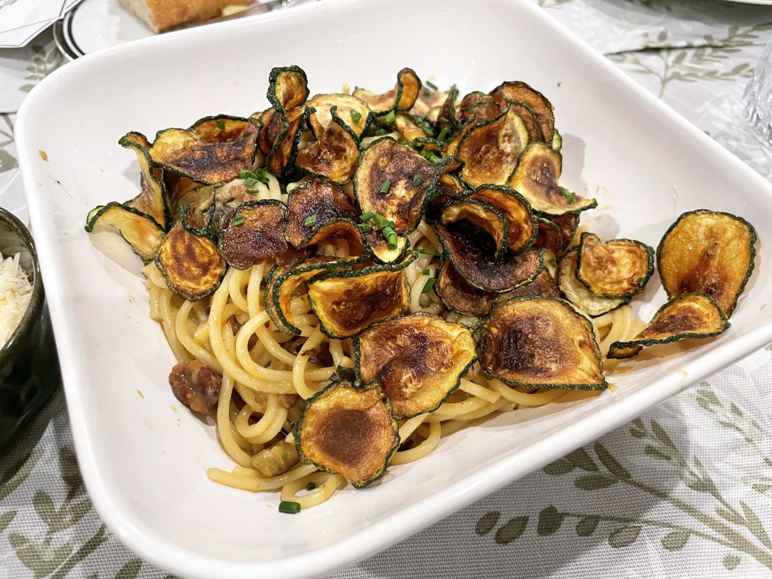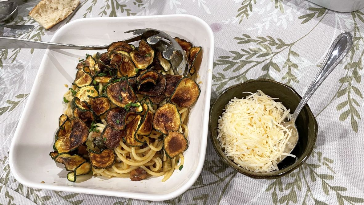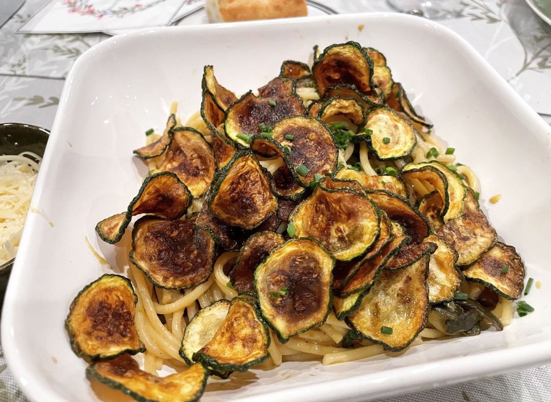There are two steps for this dish. The first thing you to do is thinly slice the zucchini, fry them and set aside. It will be used on top of the pasta.