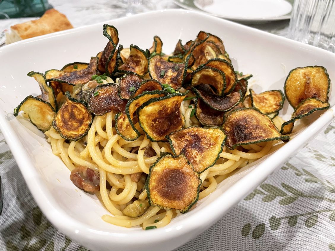 The pasta is cooked al dente and then poured in the sauce and the fried zucchini is scatter on top.