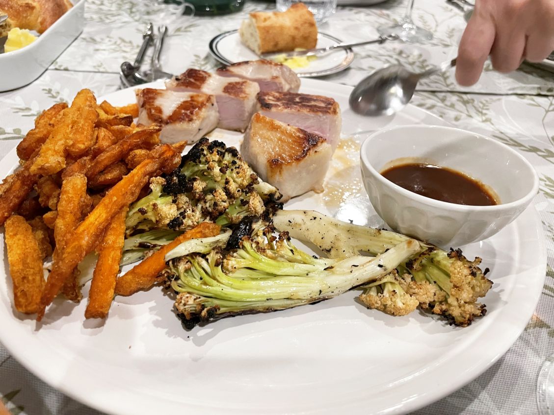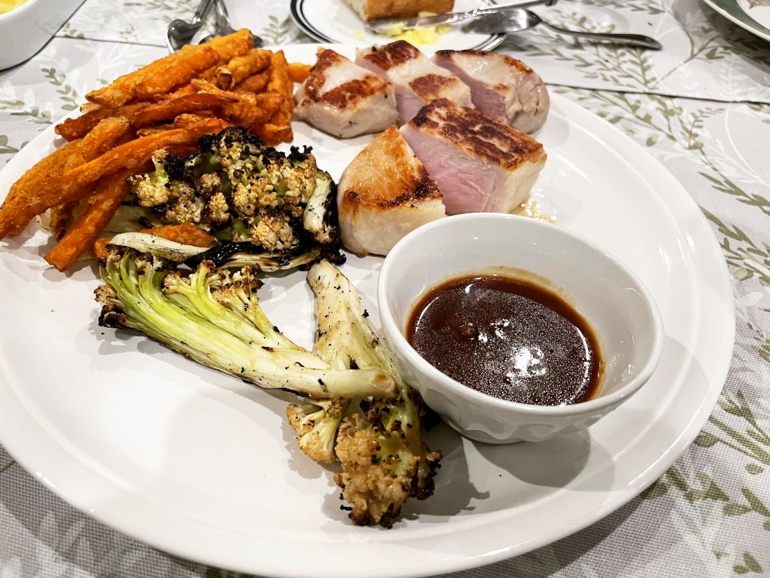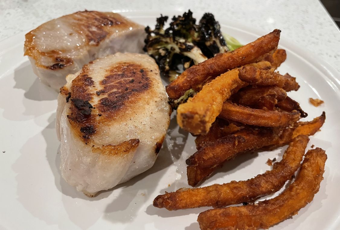Sous vide pork chops with grilled Asian Cauliflowers, and sweet potatoes fries.
