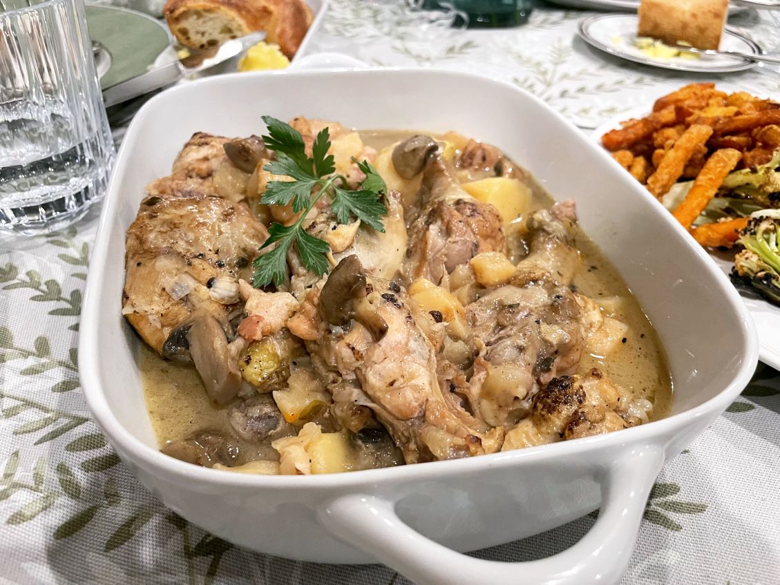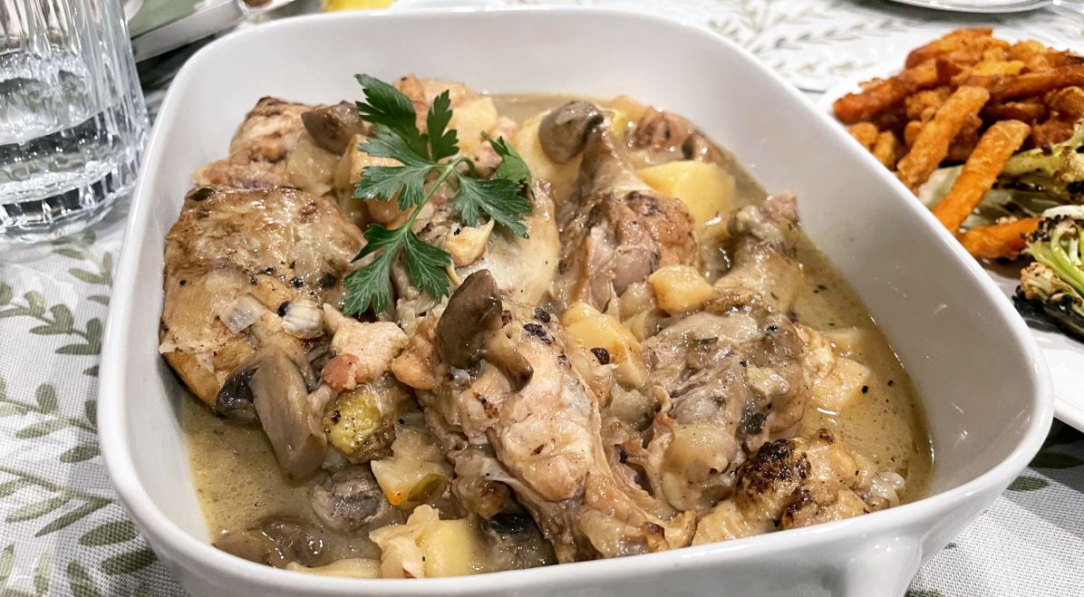 Chicken grand mere Francine is a stew dish made with pan seared chicken, mushroom, bacon, and potatoes
