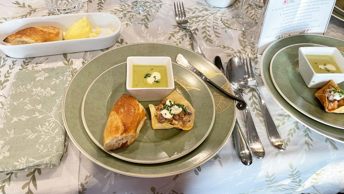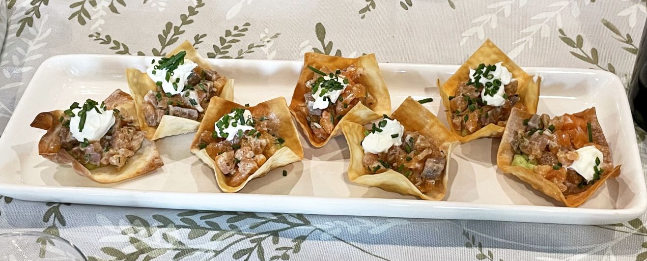 Starting the meal with an asparagus vichyssoise, Salmon tartar on crispy wonton.