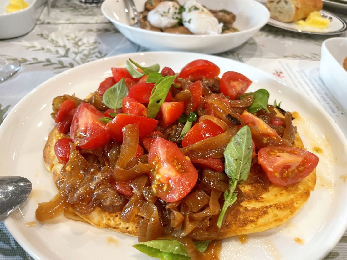 Socca with caramelized onion, roasted tomatoes, fresh cherry tomatoes, and basil.