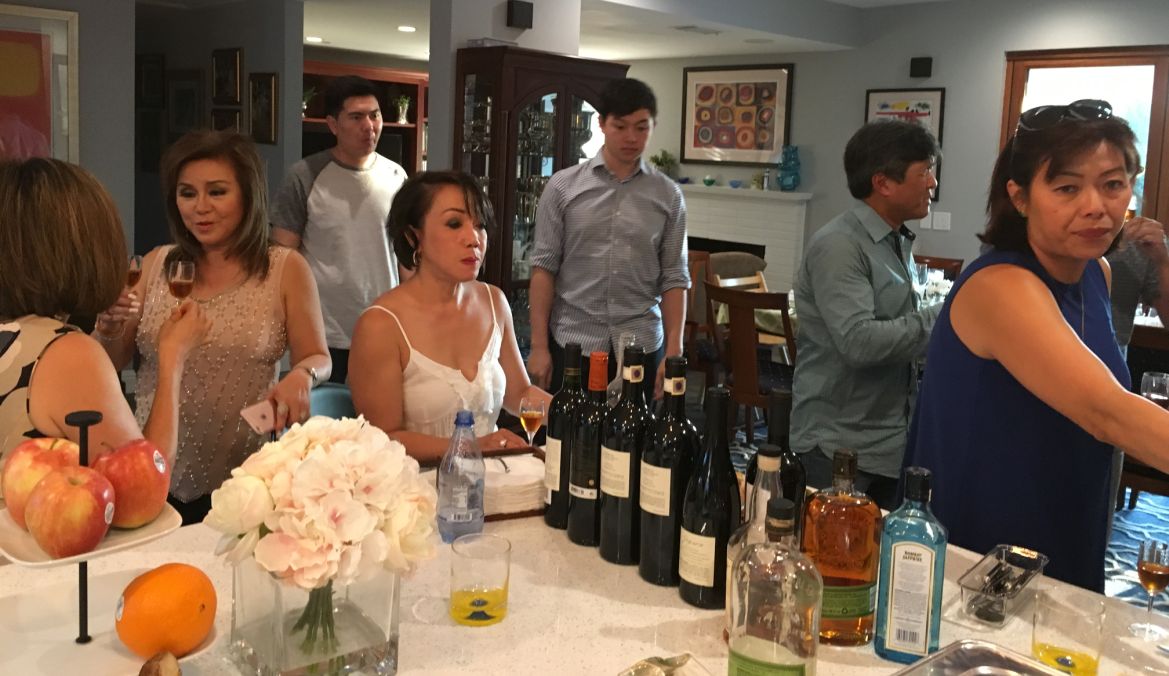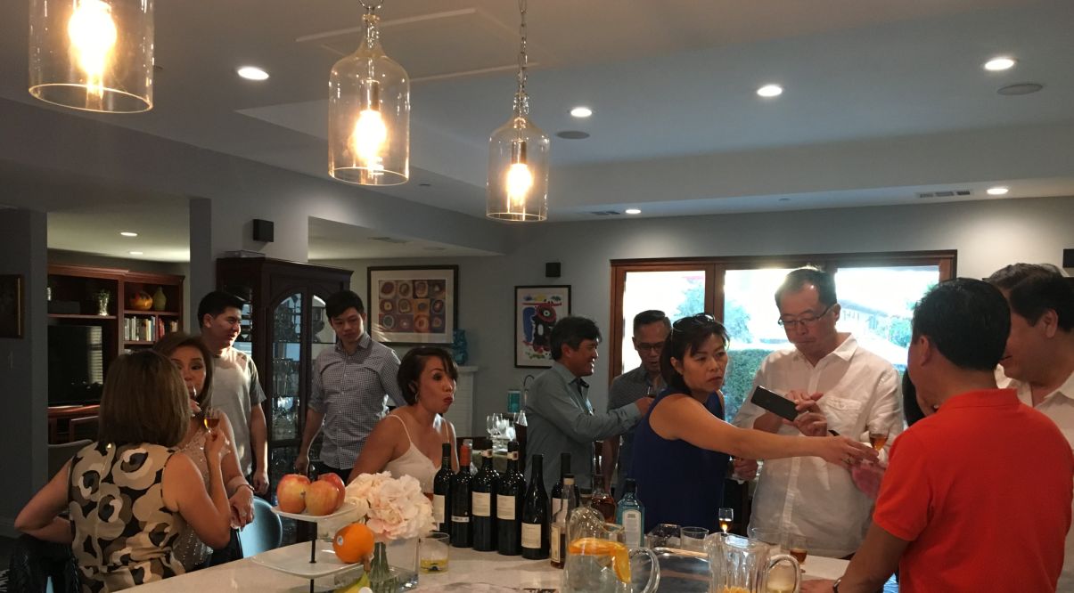 All of our guests are here, gathering around our kitchen island and enjoying a glass of Sauternes and foie gras.