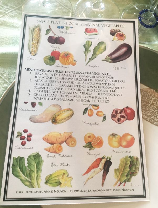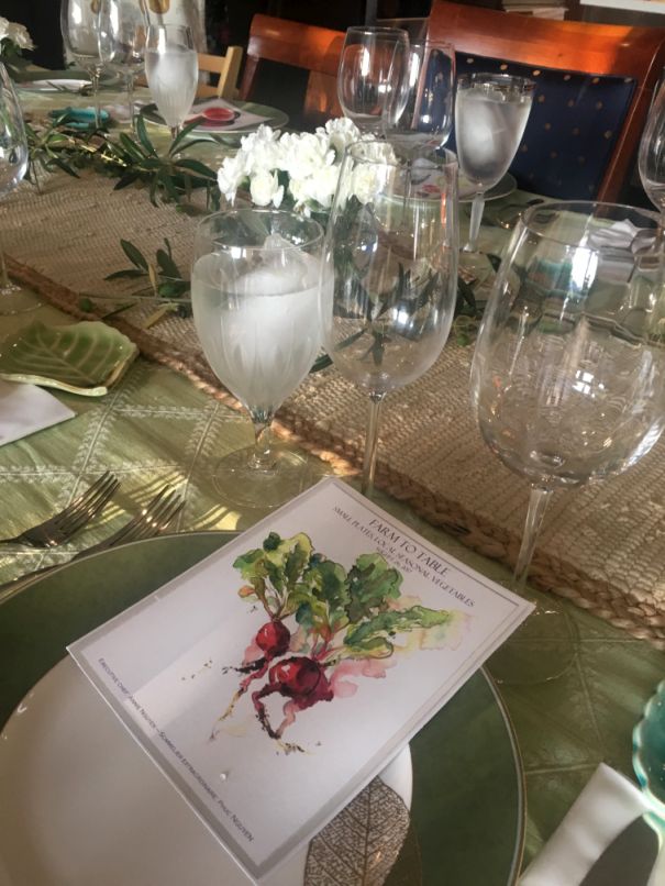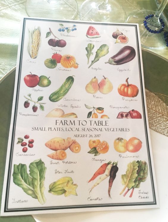 Since I wanted a colorful tablescape I designed a bunch of Menu with watercolor sketches of all sorts of vegetables representing the farm to table theme.