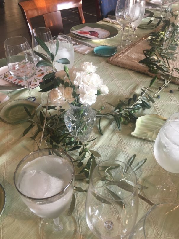 Olive branches from our garden are used as centerpiece and white flowers are added in between.