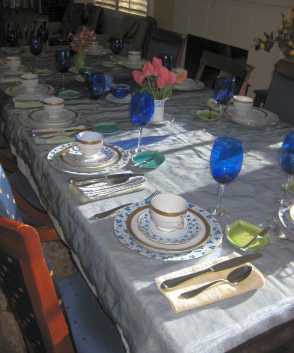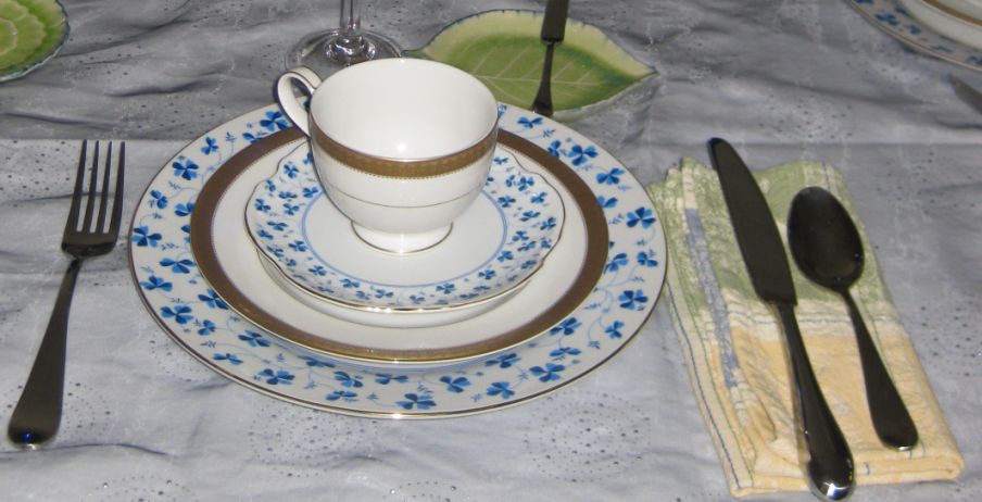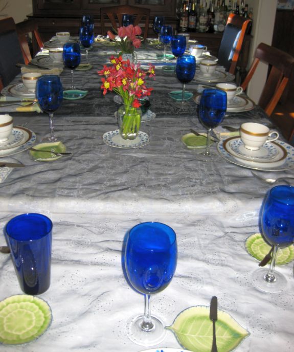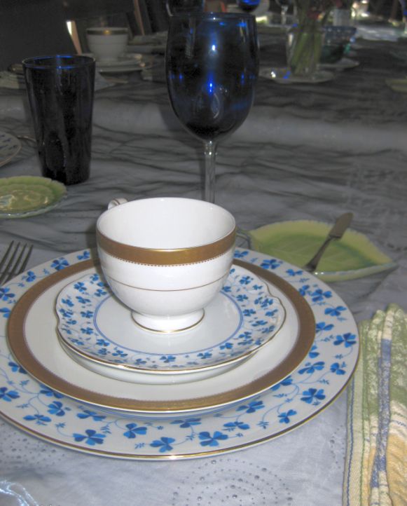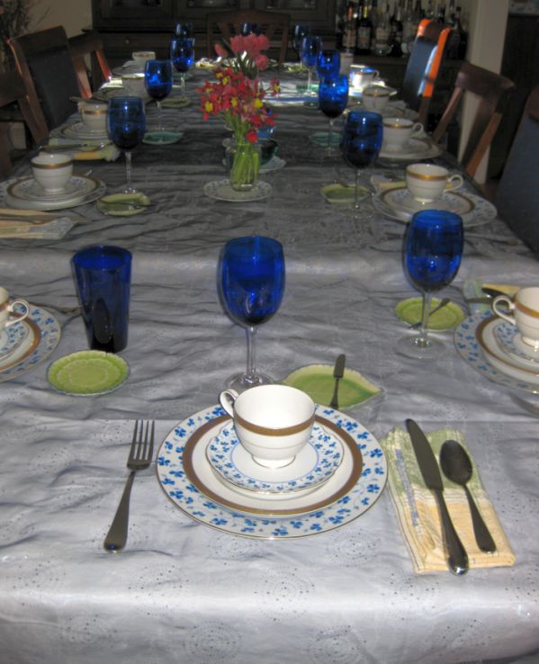 For the the plate setting I used blue plates mixed with gold plates. Blue goblins are added and green and blue leaves butter plates are added for color and texture.