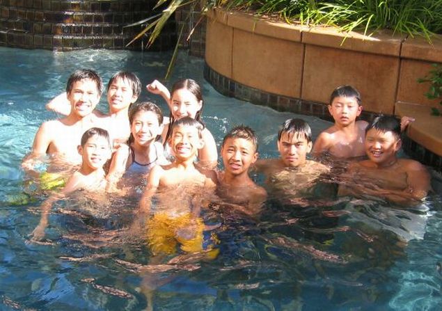 Summer 04 -Andy, Brian, Justin, Nicky (girl), Rachel, Kevin, Vu, Alex, Nicky, and Kevin Vu in Carol's swimming pool in Irvine