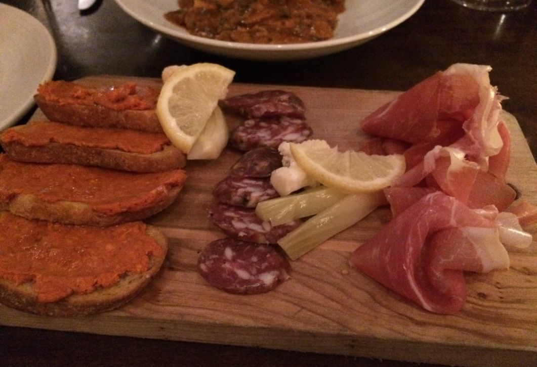from left to right: 'nduja, finochina, Prosciutto Americano and assorted pickles vegetable.